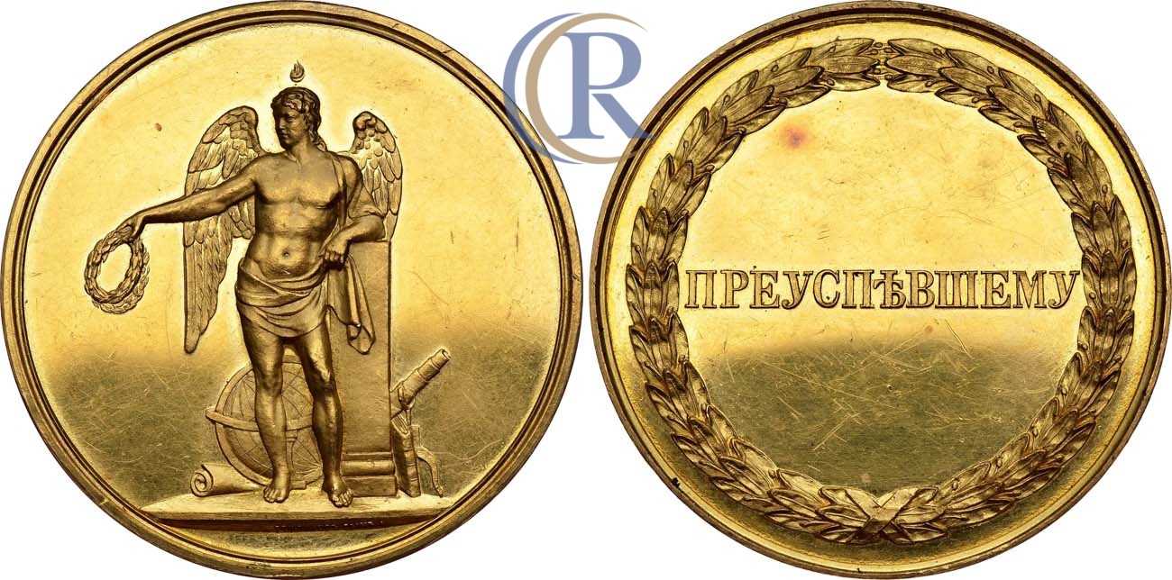 Золото. 88,81г. Диаметр 50 мм. Санкт-Петербургский монетный двор, конец XIX века. Медальер – А.А. Грилихес (сын). Аверс: на обрезе внизу: "ГРИЛИХЕСЪ СЫНЪ РЪЗ.". Реверс: копия штемпеля Г.И. Сабурова. Смирнов 483. Дьяков 529.3(R3). MS 62 PL.