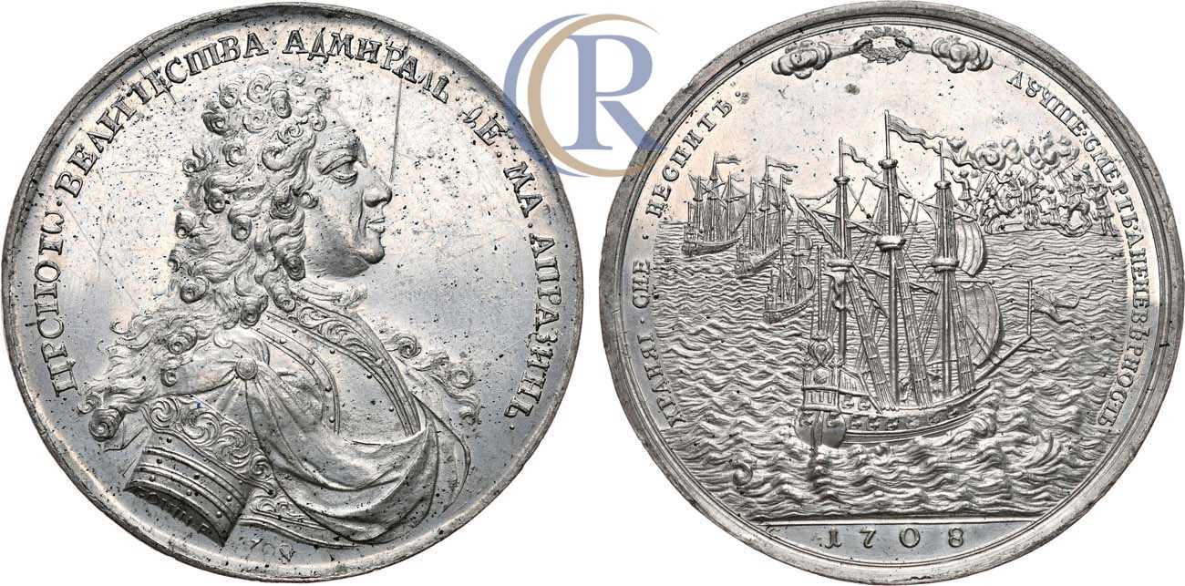 Свинцово-оловянный сплав. Диаметр 54 мм. Санкт-Петербургский монетный двор. Медальер С. Гуэн. Аверс: в обрезе рукава "GOUIN•F", под портретом дата "1708". Смирнов 179. Дьяков 26.1. MS 62.