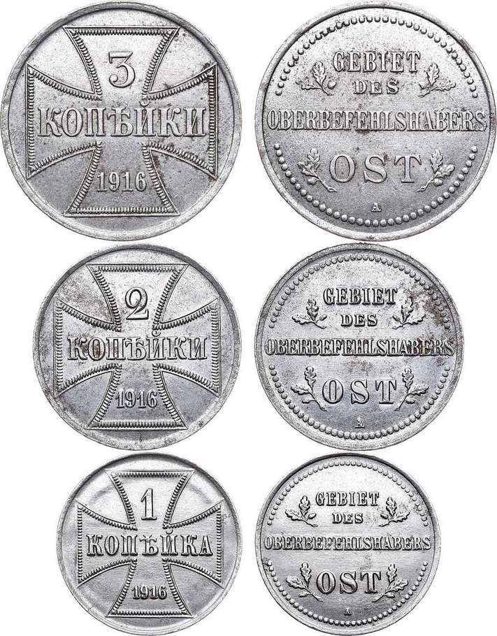 Железо. Берлинский монетный двор. 3 копейки 1916 A, 8,63 гр. MS 61. Уздеников 4944, Биткин 1. 2 копейки 1916 A, 5,87 гр. MS 62. Уздеников 4946, Биткин 4. 1 копейкаa 1916 A, 2,88 гр. MS 61. Уздеников 4948, Биткин 6.