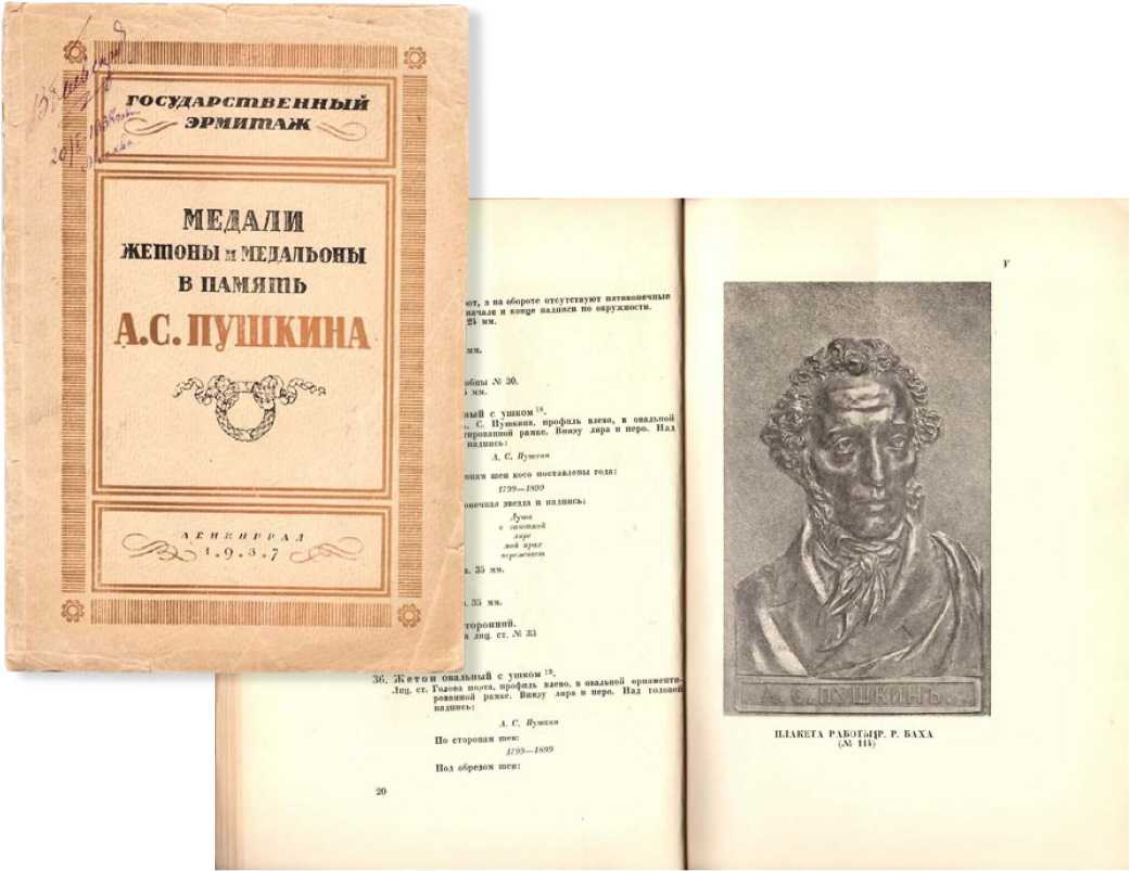 Ленинград 1937, 47 стр. Под редакцией А.А. Ильина. Издание Государственного Эрмитажа, посвященной 100-летию со дня смерти поэта. В каталоге представлены медали, плакеты, медальоны, выпущенные начиная с 1862 года.