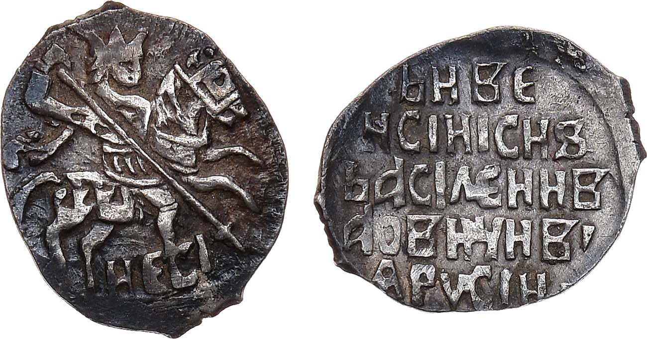 Серебро. 0,47г. Аверс: подражание новгородской копейке с литерами "НЕ(Р)СИ". Реверс: легенда с именем Василия Ивановича Шуйского. ГКХ 3484 (R-V). MS 60 (без слаба).