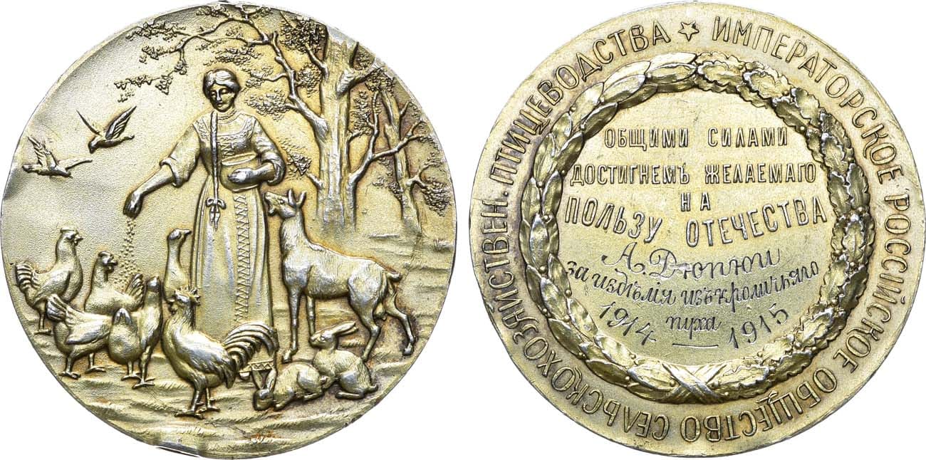 Императорское Российское общество сельскохозяйственного птицеводства состояло под покровительством Великого Князя Петра Николаевича и содействовало массовому улучшению отечественного птицеводства, кролиководства и козоводства. Интересный образец продукции выдающейся ювелирной фирмы И.П. Хлебникова.