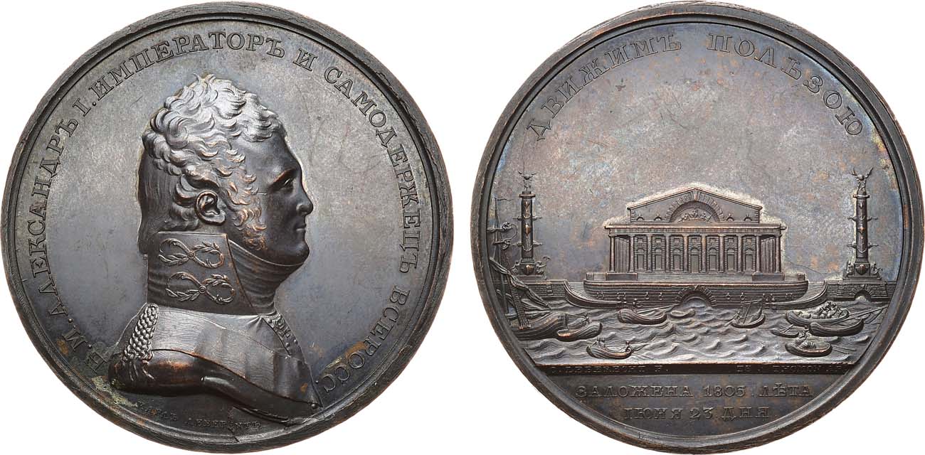 В Санкт-Петербурге Биржа сначала помещалась в Гостином дворе, находившемся на Троицкой площади Петербургской стороны. Построена она была в 1724 г. «для сходу купечества». В 1735 г. Биржа была перенесена на Васильевский остров, в так называвшуюся «Портовую таможню». В 1782 г. было заложено биржевое здание по плану архитектора Кваренги, оставшееся недостроенным, и выведена гранитная лестница. 26 февраля 1804 г. была учреждена комиссия для построения Биржи в С.-Петербурге по проекту архитектора Томона. Старое недостроенное здание было сломано, и 23 июня 1805 г. было заложено новое, оконченное в 1810 г. и торжественно открытое 15 июня 1816 г. С аукциона Ira&Larry Goldberg, Лос-Анджелес, май 2012 года, лот 3808.