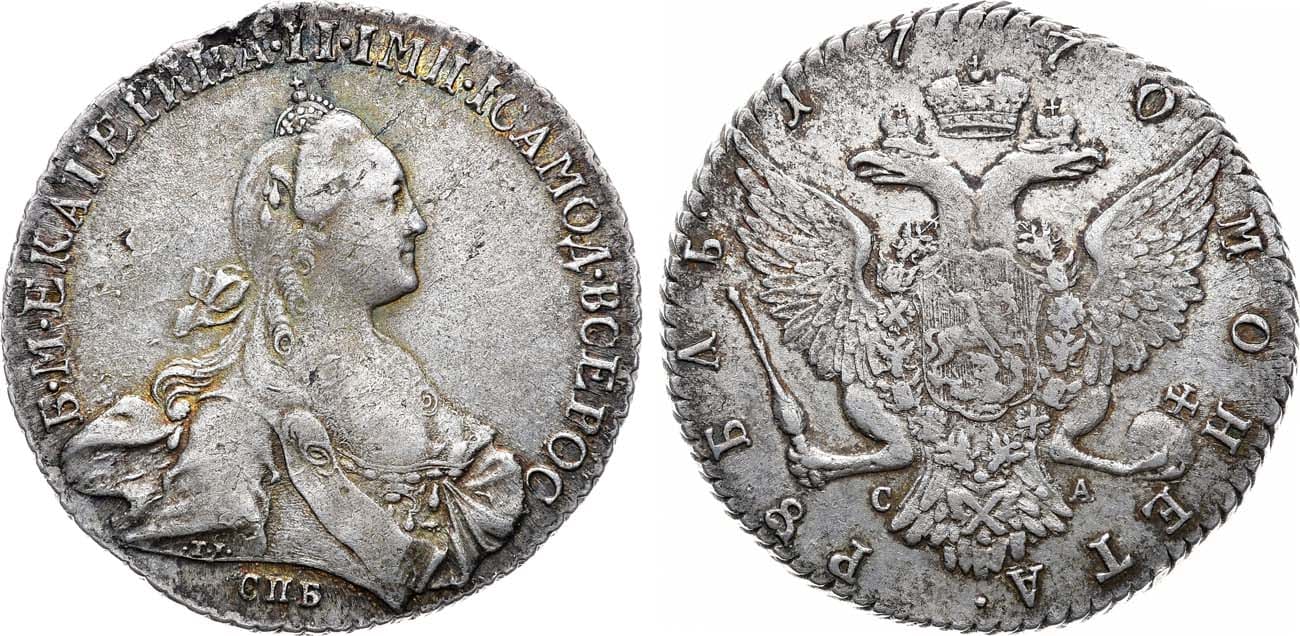 Рубли императрицы Екатерины II 1770 года с инициалами минцмейстера "СА" под орлом встречаются особенно редко.