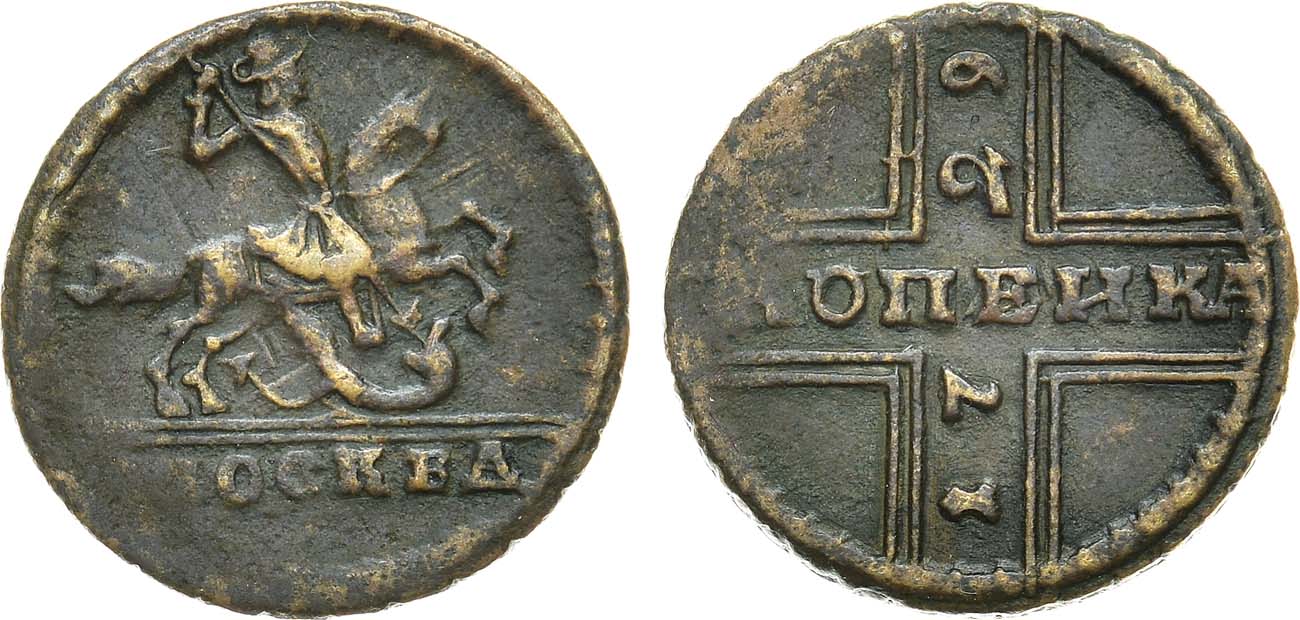 Медь. 4,77г. Кадашевский монетный двор. Реверс: всадник откинут назад. Уздеников 2476. Биткин 216(R1). 2 рубля по Петрову. 1 рубль по Ильину. Дьяков 129, 4. Brekke 72, 15(•). VF.