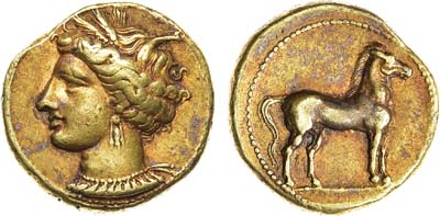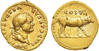 Золото. 7,3г. Рим. Аверс: круговая легенда "IMP CAESAR VESPASIANVS AVG"; портрет императора в лавровом венке вправо. Реверс: изображение коровы - вправо; строчная легенда "COS VII". RIC II 840. Calicó 622. XF.