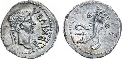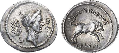 Серебро. 3,82г. Рим. Аверс: портрет Юлия Цезаря в венке вправо; изображение кадуцея справа и лавровой ветви - слева от портрета. Реверс: изображение быка вправо; легенда "L LIVINEIVS REGVLVS". Sear 1425. XF+.