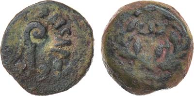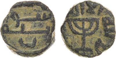 Бронза. 3,2г. Аверс: изображение виноградного листа на ветке; круговая легенда - обозначение даты на древнем иврите (второй год (войны), 67-68 гг). Реверс: изображение амфоры с ручками; круговая легенда на древнем иврите: "Свобода Сиона". Hendin 661. XF+.