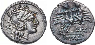 Серебро. 4,02г. Рим. Аверс: изображение головы Ромы в шлеме - вправо, сзади - круговая легенда "XVI". Реверс: изображение скачущих Диоскуров на лошадях - вправо, ниже легенда "L•IVI", под линией обреза "ROMA". Sear 100. XF+/AU.