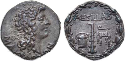 Серебро. 16,39г. Салоники. Аверс: круговая легенда "ΜΑΚΕΔΟΝΩΝ"; портрет Александра Македонского вправо. Реверс: строчная легенда "AESILLAS"; изображения внутри лаврового венка: дубина Геракла; корзина/сундук с деньгами слева и кресло квестора - справа. Bauslaugh Group II. XF+.