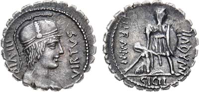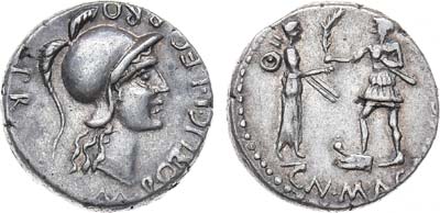 Серебро. 3,85г. Кордуба (Кордова). Аверс: круговая легенда "M POBLICI LEG PRO PR"; изображение богини Ромы в шлеме - вправо. Реверс: круговая легенда "CN MAGNVS IMP"; ростовое изображение Испании, передающей пальмовую ветвь солдату Помпея. Sear 1384. XF+/AU.