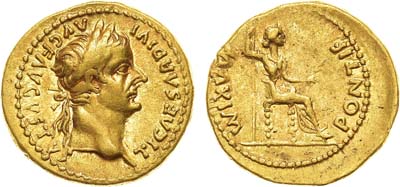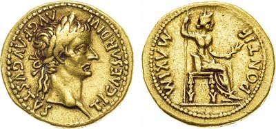 Золото. 7,73г. Лугдун (Лион). Аверс: портрет императора в лавровом венке вправо; круговая легенда "TI CAESAR DIVI AVG F AVGVSTVS". Реверс: изображение женской фигуры на троне со скипетром и ветвью в руках - вправо; круговая легенда "PONTIF MAXIM". Sear 1760. RIC 25. XF.