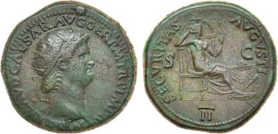 Бронза. 12,15г. Лугдунум (Лион). Аверс: круговая легенда "NERO CLAVD CAESAR AVG GER P M TR P IMP P P"; портрет императора вправо. Реверс: круговая легенда "SECVRIT AVGVSTI / S C"; изображение богини Секуритас на троне со скипетром - вправо. RIC 376. AU.