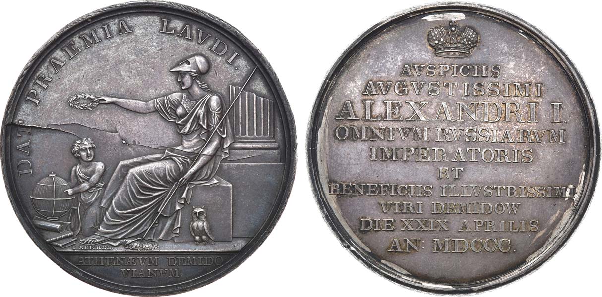 Серебро. 62,11г. Диаметр 54 мм. Санкт-Петербургский монетный двор. Медальер Я. Рейхель (реверс: слева над обрезом: "I.REICHEL"). Аверс: круговая легенда: «DAT PRAEMIA LAVDI» ("Награждает успехи"); внизу под обрезом в 2 строки — «ATHENÆVM DEMIDO / VIANVM» ("Демидовский лицей"). Реверс: строчная легенда: «AVSPICIIS / AVGVSTISSIMI / ALEXANDRI I / OMNIVM RVSSIARVM / IMPERATORIS / ET /BENEFICIIS ILLVSTRISSIMI / VIRI DEMIDOW / DIE XXIX APRILIS / AN MDCCC.» ("Под августейшим покровительством Александра I, благодеяниями великого мужа Демидова. 29 апреля 1800 года"). Дьяков 261.1 (R3). AU.