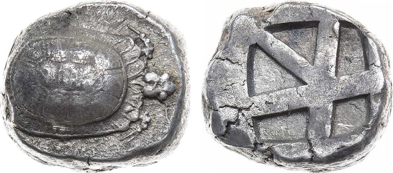 Серебро. 12,22г. Аверс: изображение черепахи. Реверс: вдавленные геометрические фигуры. Milbank pl. II, 12; SNG Delepierre 1535. AU.
