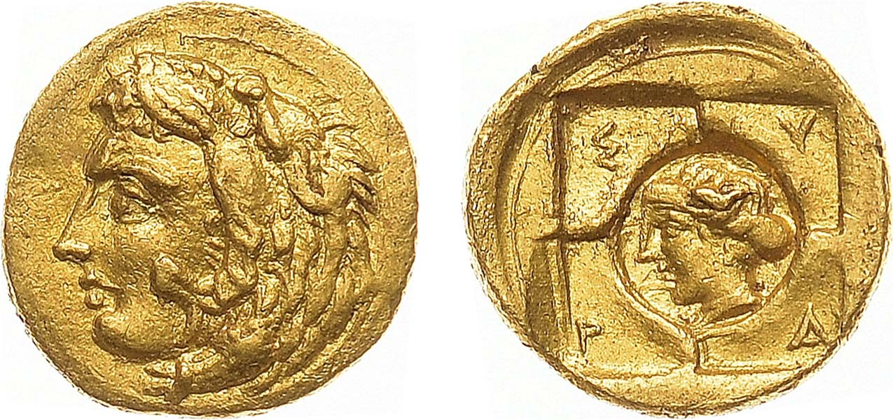 Золото. 1,15г. Аверс: изображение Геракла в львиной шкуре - влево. Реверс: четыре вдавленных квадрата (по одной букве из легенды "ΣYPA" в каждом квадрате); изображение головы нимфы Аретусы - влево. SNG München 1084. UNC.