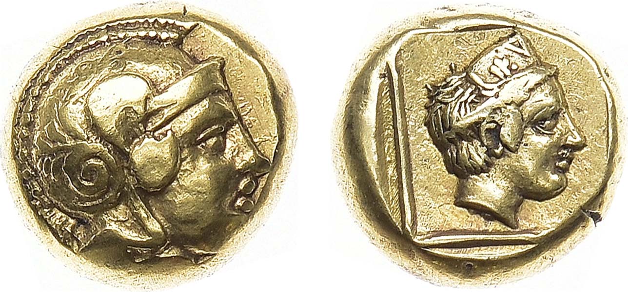 Электр. 2,52г. Аверс: изображение головы Афины в аттическом шлеме - вправо. Реверс: изображение головы Кибелы - вправо, внутри вдавленного квадрата. Bodenstedt 73. XF.