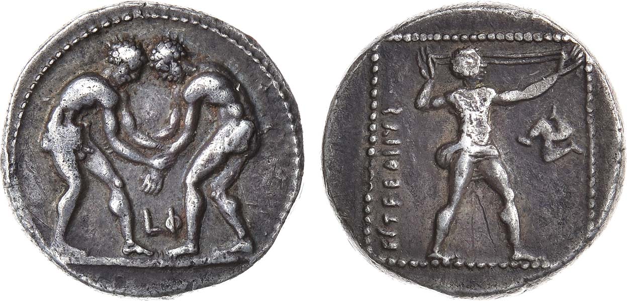Серебро. 10,73г. Аспенд. Аверс: изображение двух борцов; монограмма "LФ" в нижней части. Реверс: изображение фигуры вправо; на поле справа трискелион; вертикальная легенда "EΣTFEΔIIYΣ". XF.