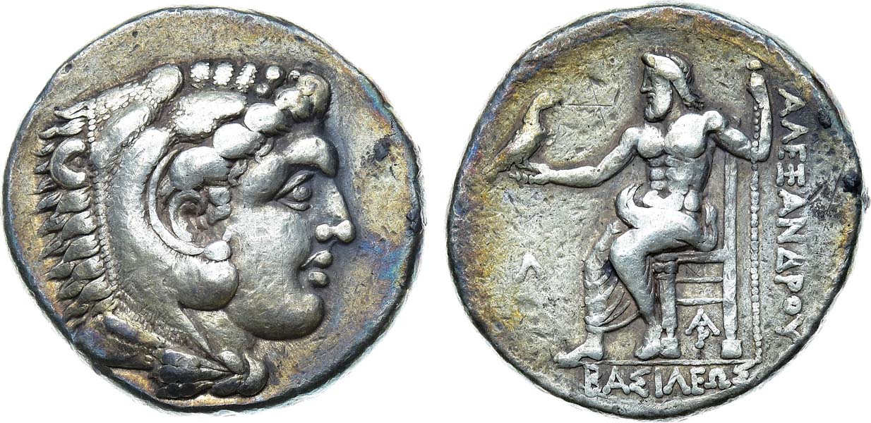 Серебро. 17,1г. Аверс: изображение головы Геракла в львиной шкуре - вправо. Реверс: изображение Зевса на троне - влево; с орлом в правой руке и скипетром - в левой; круговая легенда "ΒΑΣΙΛΕΩΣ AΛEΞANΔPOY"; монограмма "Λ" на поле слева, монограмма "АР" под изображением трона. VF.