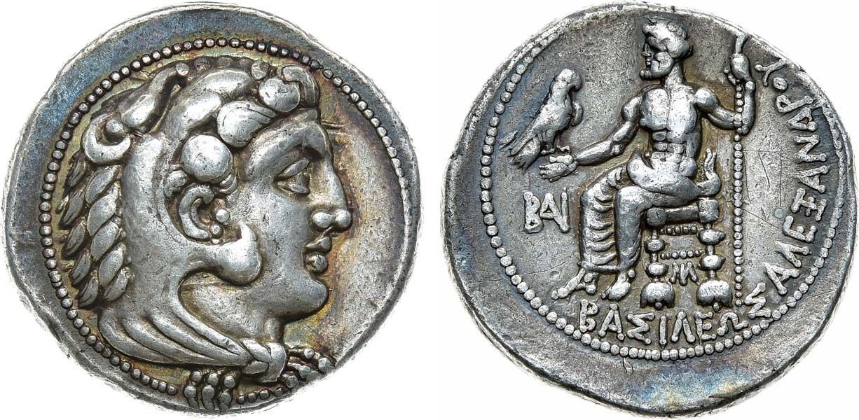 Серебро. 17,15г. Аверс: изображение головы Геракла в львиной шкуре - вправо. Реверс: изображение Зевса на троне - влево; с орлом в правой руке и скипетром - в левой; круговая легенда "ΒΑΣΙΛΕΩΣ AΛEΞANΔPOY"; монограмма "ВАI" на поле слева, монограмма "М" под изображением трона. XF.