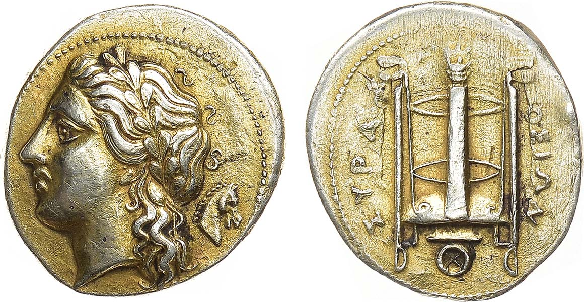 Электр. 3,69г. Аверс: изображение головы Аполлона в лавровом венке - влево; изображение головы лошади - справа. Реверс: круговая легенда "ΣYPAKOΣIΩN". SNG ANS 631. XF.