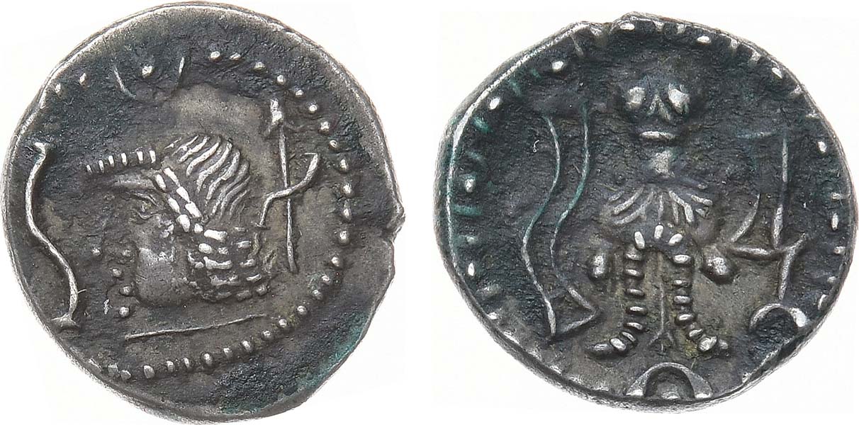 Серебро. 2,79г. Аверс: изображение головы влево. Реверс: изображение букрания (головы быка). SNG ANS 1602; Arabia Felix pl. III, 68-71. AU/UNC.