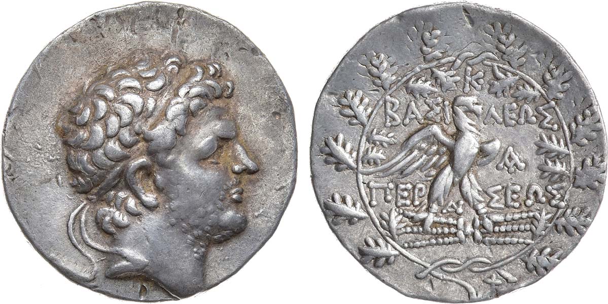 Серебро. 15,21г. Пелла. Аверс: изображение головы Персея в диадеме вправо. Реверс: горизонтальная легенда "ΒΑΣΙΛΕΩΣ ΠΕΡΣΕΩΣ"; изображение сидящего на молниях орла - вправо. SNG Cop 1269. AU.