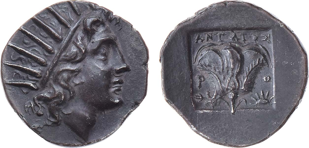 Серебро. 2,21г. Аверс: изображение головы Гелиоса вправо. Реверс: изображение розы с листом и восходящего солнца; строчная легенда "ANTAIOΣ" вверху. Kraay-Mørkholm Essays 128. AU/UNC.