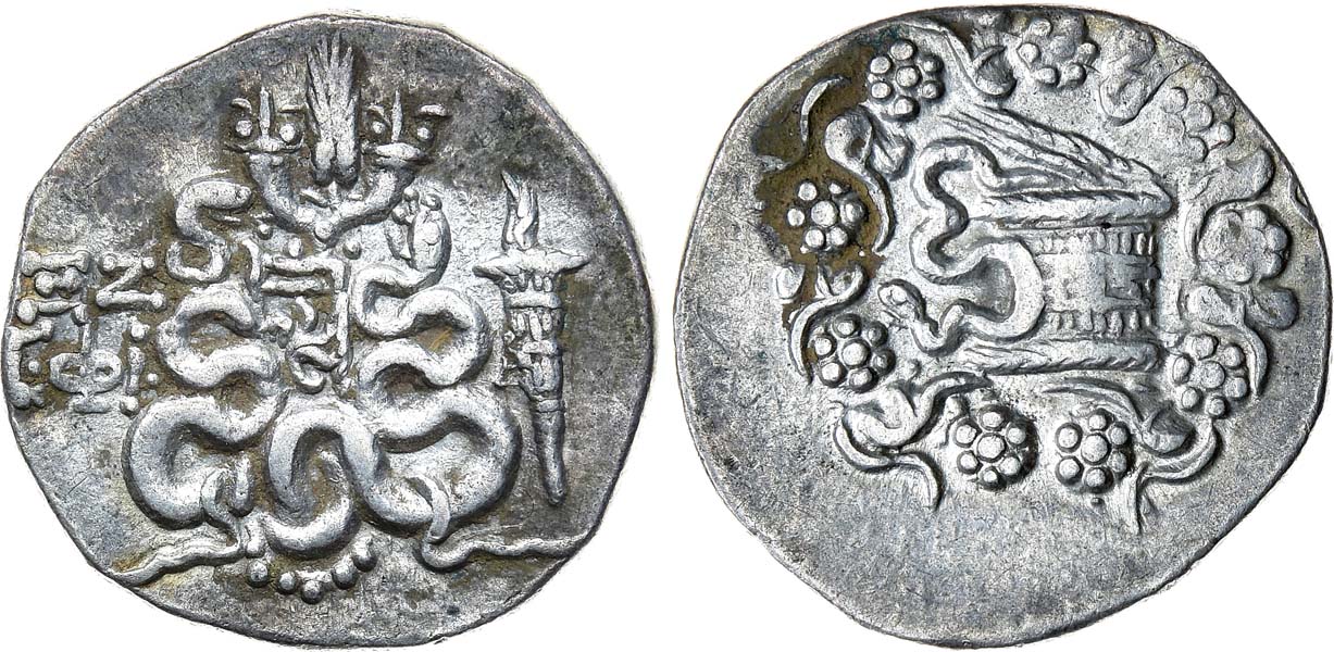 Серебро. 12,52г. Аверс: изображение змеи, выползающей из корзины. Реверс: изображение змей, рогов изобилия и факела. Kleiner, Ephesus 73. XF+.