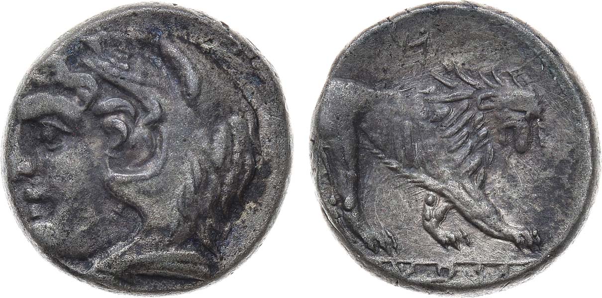 Серебро. 7,16г. Карфаген. Аверс: изображение головы Геракла в львиной шкуре - влево. Реверс: изображение идущего льва вправо; ниже - строчная легенда "ΛIBYΩN". Carradice & La Niece pp. 32-52; MAA 53; SNG Copenhagen 240. AU.