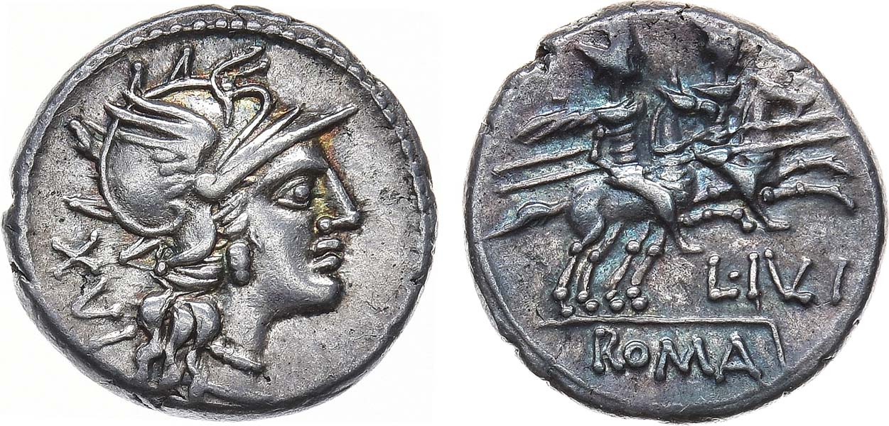 Серебро. 4,02г. Рим. Аверс: изображение головы Ромы в шлеме - вправо, сзади - круговая легенда "XVI". Реверс: изображение скачущих Диоскуров на лошадях - вправо, ниже легенда "L•IVI", под линией обреза "ROMA". Sear 100. XF+/AU.