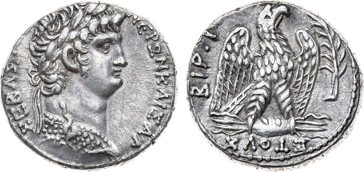 Серебро. 15,18г. Антиохия. Аверс: круговая легенда "ΝΕΡΩΝ ΚΑΙΣΑΡ ΣΕΒΑΣΤΟΣ", портрет Нерона вправо. Реверс: легенда "ETOΥΣ — BIP•I", изображение орла с распростертыми крыльями - вправо; справа пальмовая ветвь. McAlee 265a. Prieur 89. RPC I 4188.. AU.