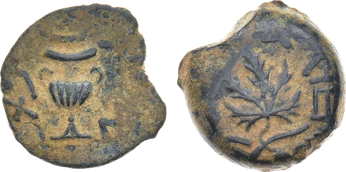 Бронза. 3,2г. Аверс: изображение виноградного листа на ветке; круговая легенда - обозначение даты на древнем иврите (второй год (войны), 67-68 гг). Реверс: изображение амфоры с ручками; круговая легенда на древнем иврите: "Свобода Сиона". Hendin 661. XF+.