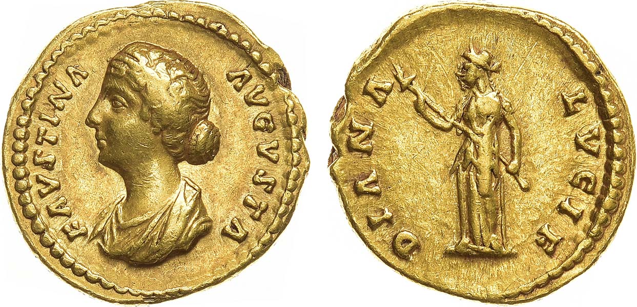 Золото. 7,24г. Рим. Аверс: круговая легенда "FAVSTINA AVGVSTA "; изображение Фаустины влево. Реверс: круговая легенда "DIANA LVCIF"; фигура Дианы влево с копьём в руках. Sear 5237. XF+/AU.