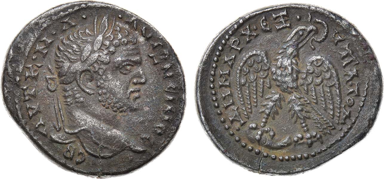 Серебро. 12,23г. Антиохия-на-Оронте. Аверс: круговая легенда "AYTK M A ANTΩNEINOC"; портрет императора в лавровом венке вправо. Реверс: круговая легенда "ΔHMAPX EΞ YΠA TO Δ"; орёл с распростёртыми крыльями обращён вправо. AU.