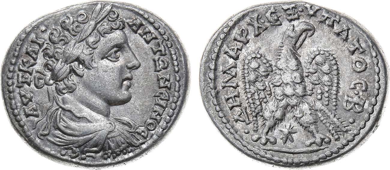 Серебро. 13,51г. Аверс: круговая легенда "•AYT•KAI• ANTΩNEINOC•CC•"; портрет императора в лавровом венке вправо. Реверс: круговая легенда "ΔHMAP•X•EΞYΠAС•TO•Г"; орёл с распростёртыми крыльями обращён влево. AU.