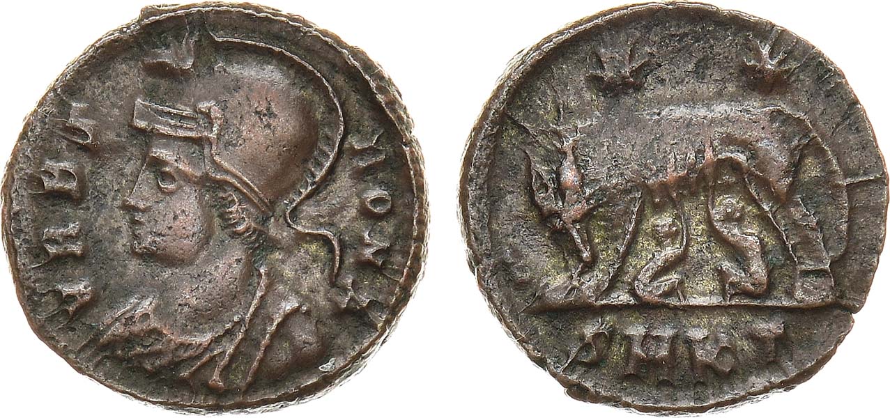 Биллон. 2,45г. Кизик. Аверс: персонификация Рима в шлеме и в императорских одеяниях - влево; круговая легенда "VRBS ROMA" ("Град Рим"). Реверс: волчица, кормящая Рема и Ромула; над ними две звезды. Внизу - знак оффицины "А" (=1) и обозначение монетного двора "SMK" (Кизик). Sear 16513. XF+.