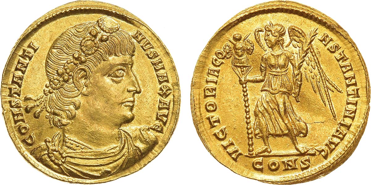 Золото. 4,65г. Константинополь. Аверс: круговая легенда "CONSTANTINVS MAX AVG"; портрет императора вправо. Реверс: круговая легенда "VICTORIA CONSTANTINI AVG"; изображение богини Виктории в военных доспехах влево, с колосом и штандартом в руках; под обрезом "CONS". Sear 15744. UNC.