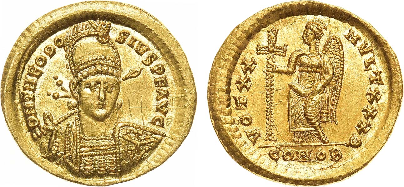 Золото. 4,41г. Константинополь. Аверс: поясной портрет императора с копьём; легенда "DN THEODO SIVSPFAVG". Реверс: круговая легенда "VOT ХХ MULT ХХХѲ"; изображение богини Виктории с крестом в правой руке; под обрезом "CONOB"; Sear 21155. UNC.