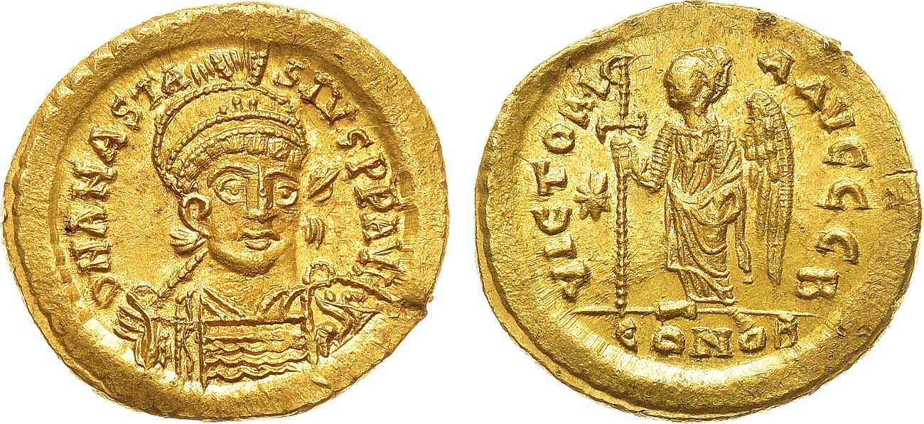 Золото. 4,46г. Константинополь. Аверс: круговая легенда "DN ANASTA-SIVS PP AVG"; портрет императора анфас в доспехах и шлеме, с копьём на правом плече. Реверс: круговая легенда "VICTORI-A-AVCCCB"; изображение Ангела влево с крестом в правой руке, слева на поле звезда, под линией обреза "CONOB"; Sear 4. UNC.