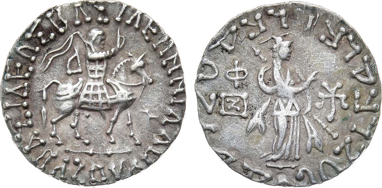 Серебро. 9,57г. Аверс: изображение царя на коне с поднятой правой рукой и с хлыстом - в левой; круговая легенда. Реверс: круговая легенда; изображение идущей вправо Афины с копьём. Senior 98.428; MIG 848g corr. (Azes II). AU.