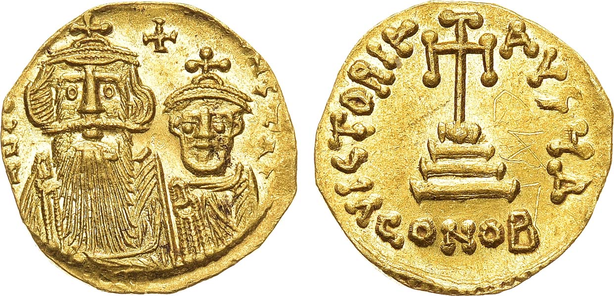 Золото. 4,46г. Константинополь. Аверс: круговая легенда "DN CONSTAN-TINЧS C CONSTANI", портреты императоров Константа II и Константина IV в коронах с крестами; между ними на поле маленький крест. Реверс: круговая легенда "VICTORIA-AVГЧΔ"; изображение Креста на трёх ступенях, внизу - "CONOB". Sear 959. Sommer 12.18. AU/UNC.