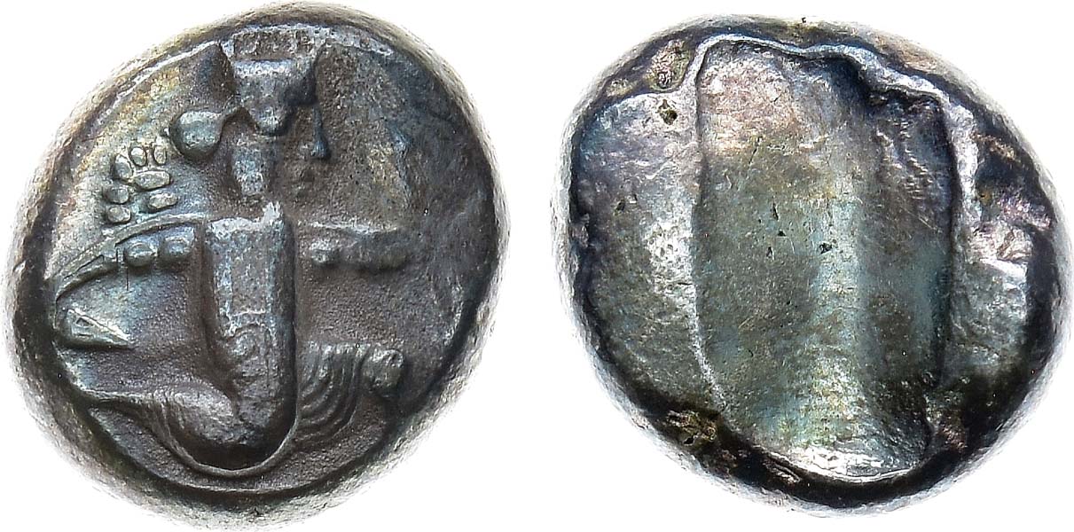 Серебро. 5,54г. Аверс: изображение царя в виде лучника, стоящего на колене, с копьём - вправо. Реверс: архаическое оформление – вдавленный прямоугольник с неровной поверхностью. VF.