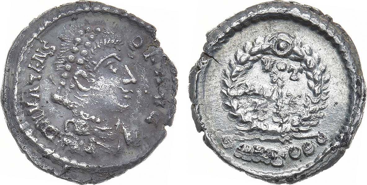 Серебро. 2,62г. Балканский полуостров. Подражание силикве императора Валенса чеканки Антиохии (Sear 19699). Аверс: подражательная круговая легенда "D B VALENS PF AVG"; портрет императора вправо. Реверс: строчная легенда в венке "VOT X MVLT XX ANT •••" RSC: тип 96p. UNC.