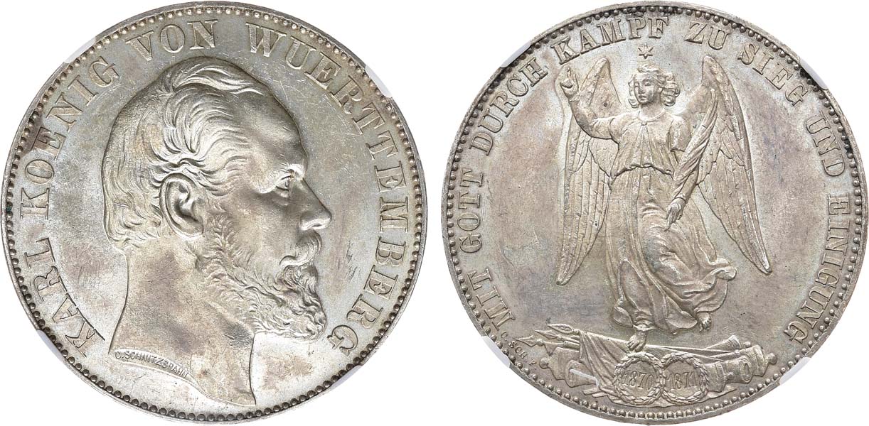 Серебро. Штутгарт. Отчеканена в память победы в Франко-Прусской войне. Тираж: 113674 экз. KM 620. AKS 132. Jaeger 86. Thun 443. Kahnt 594. MS 64.