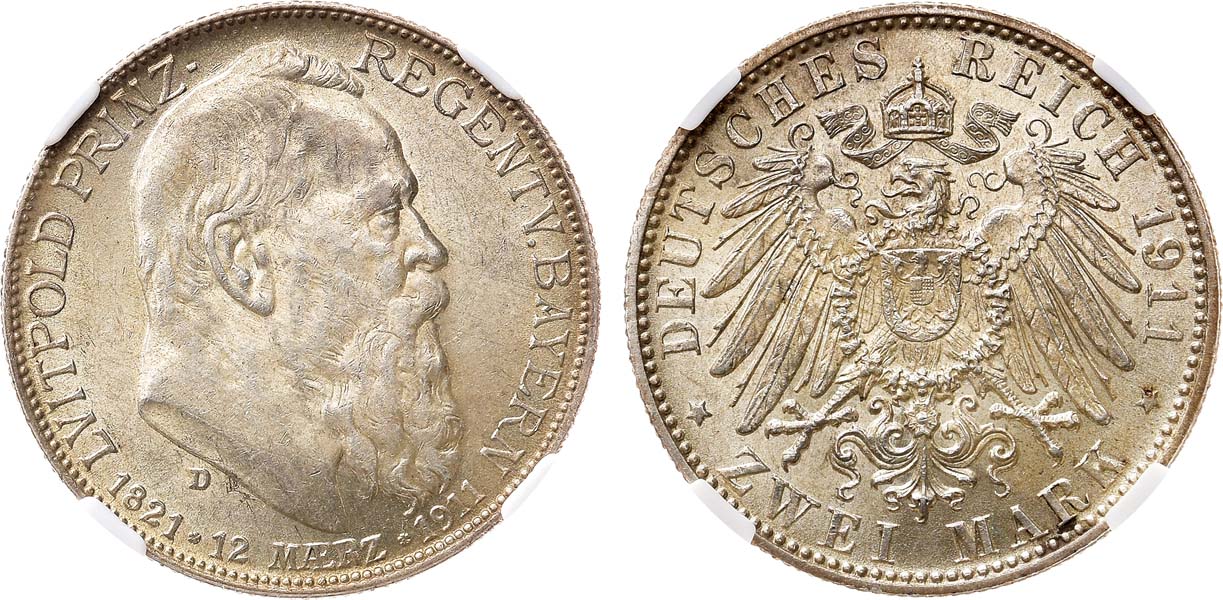 Серебро. Мюнхен (D). Отчеканена в память 90-летия со дня рождения Луитпольда Баварского и 25-летия его правления. Тираж: 640000 экз. KM 997. Jaeger 48. Weege 48. MS 63.