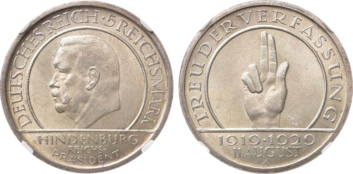 Серебро. Берлин (A). Отчеканена в память 10-летия принятия Веймарской конституции. Тираж: 325000 экз. KM 64. Jaeger 341. MS 64.