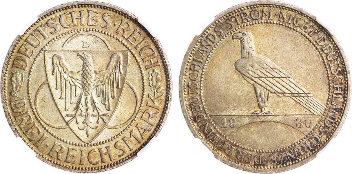 Серебро. Мюнхен (D). Отчеканена в память освобождения Рейнской области (Рейнланда). Тираж: 499920 экз. KM 70. Jaeger 345. Weege 46. MS 64.