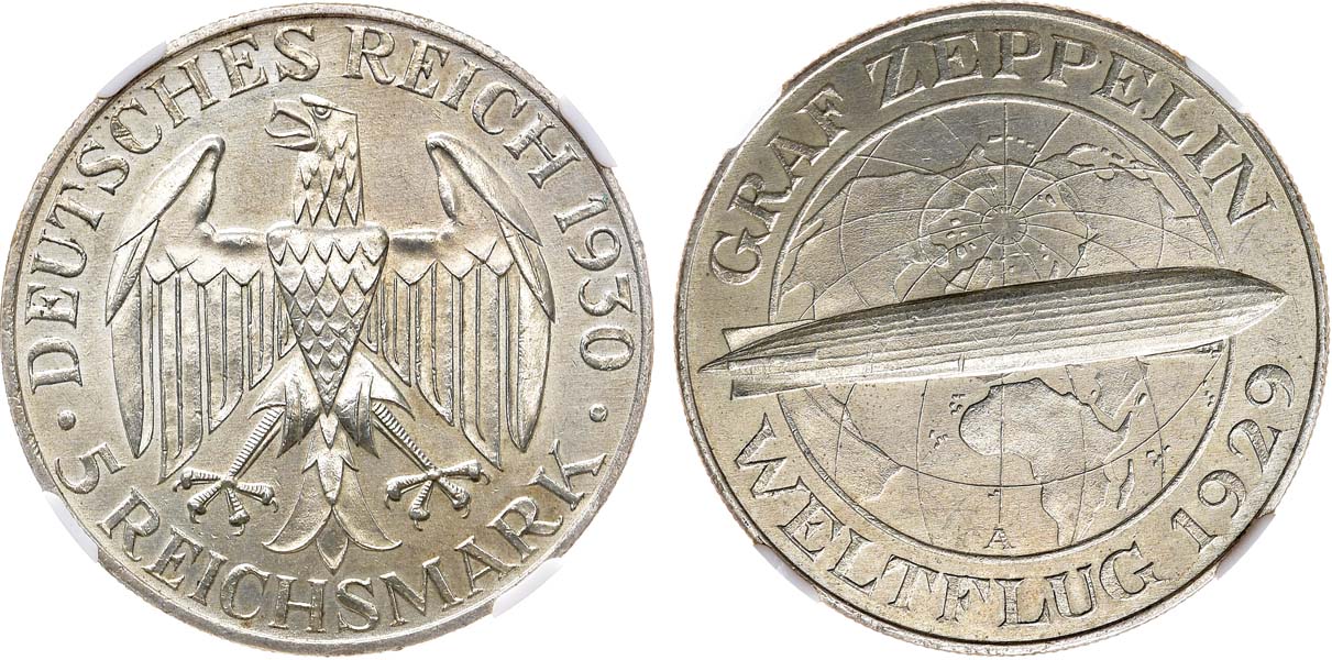 Серебро. Берлин (A). Отчеканена в память полёта дирижабля "Граф Цеппелин". Тираж: 217000 экз. KM 68. Jaeger 343. Weege 44. MS 64.