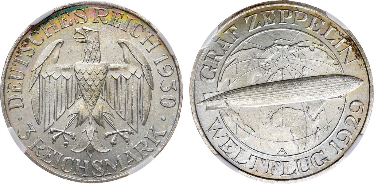 Серебро. Берлин (A). Отчеканена в память полёта дирижабля "Граф Цеппелин". Тираж: 541900 экз. KM 67. Jaeger 342. Weege 43.. MS 64.